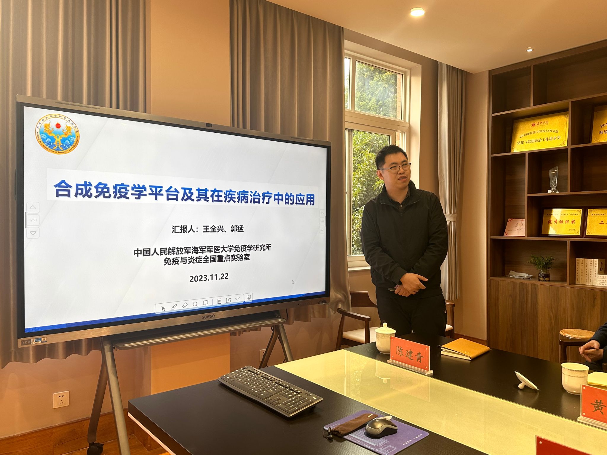 陈云飞代表学院对王全兴教授一行来访表示欢迎,并从师资队伍建设、教学组织建设、学科建设等方面对中文av 作了介绍。王全兴团队成员郭猛博士对本团队在免疫学领域所做的最新研究进展和取得的成果进行了交流,王全兴教授希望双方能够共同推进部队院校高层次科研团队与中文av 、G60研究院在科研团队能力提升建设、国家级项目有效申报、大学生创新创业竞赛高质量成果产出以及科研成果的转化等方面开展合作。