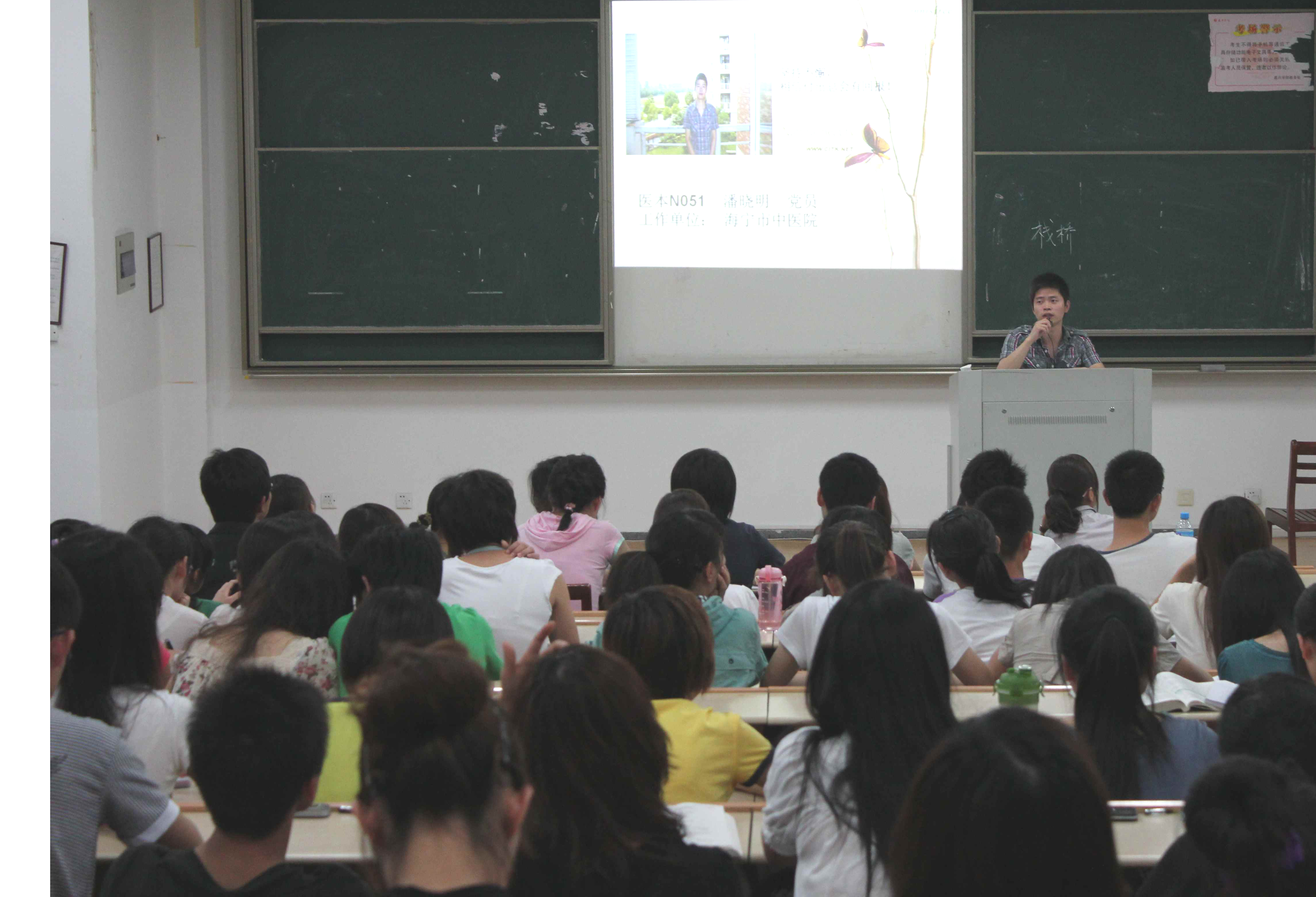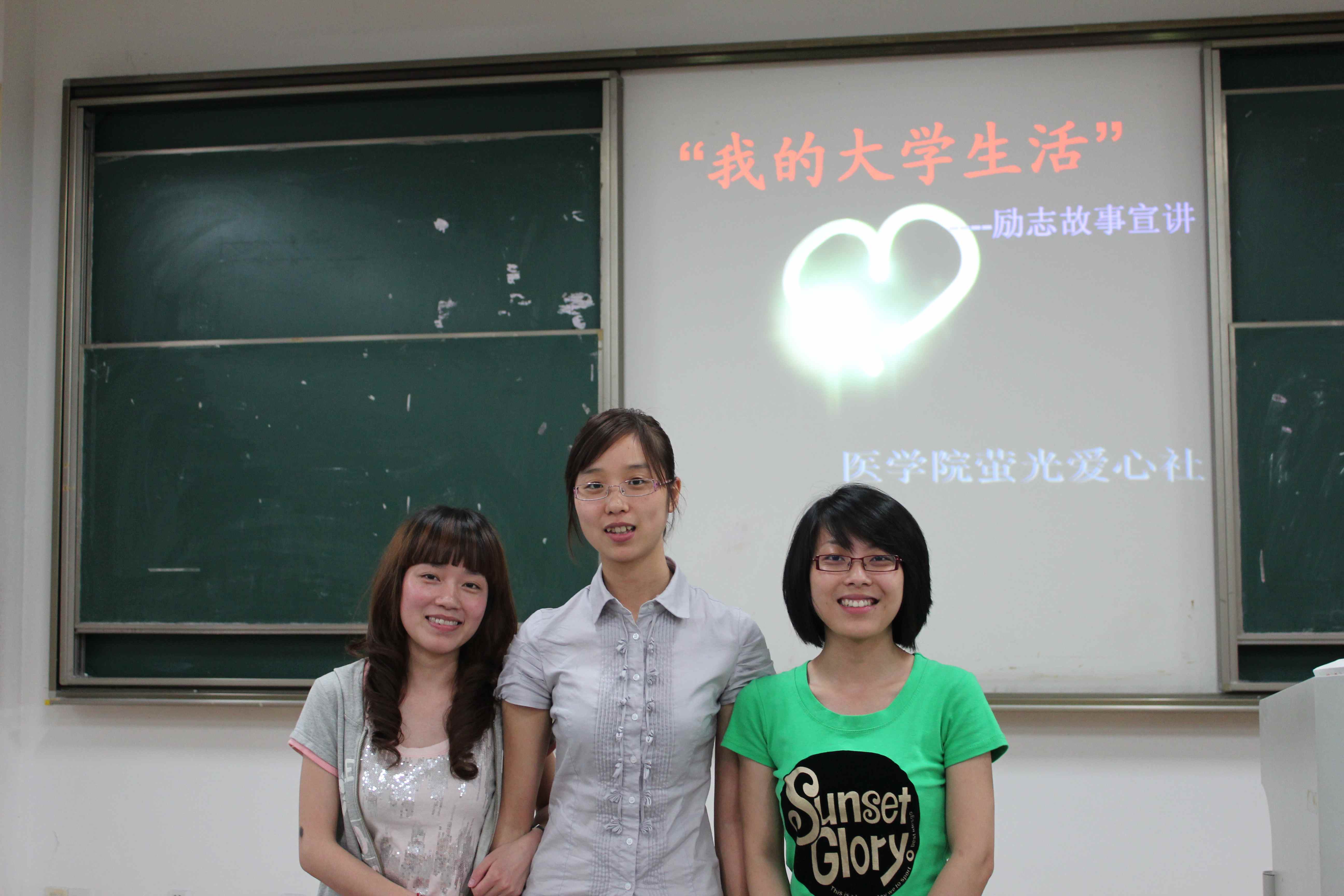 6月12日晚上6点半,在教四221举行了由荧光爱心社承办的“我的大学生活”励志故事宣讲活动,中文av 党总支副书记谢宏老师、学工办杨敏老师和社工委副主席孙巧云同学及中文av 全体贫困生、荧光爱心社成员参加了此次活动。 本次活动特邀请了医本051徐欢、医本051的周少余、医本N051的潘晓明和护本061的吴毅疑四位2010届毕业生来为大家讲述他们不平凡的大学生活,和学弟学妹们分享他们在学校、在实习中所获得的宝贵经验,以此来激励大家学会把握自己,励志成才。 最后,谢宏老师做了总结发言,她强调:虽然我们不能选择自己的出生,但我们可以选择自己的人生,同时她也勉励大家:选择坚强,选择不松懈不放弃,我们的人生道路才会走得更好、更远!