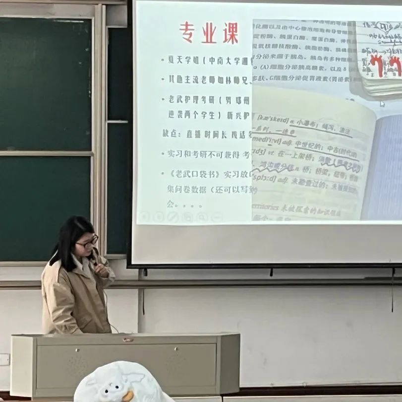随后,护本192班郭蕴瑜、护理N192班尹雨爽两位学姐进行考研经验分享。郭蕴瑜学姐目前已被浙江大学护理专业拟录取,尹雨爽学姐以第一名的成绩被绍兴文理学院护理专业拟录取。她们热情地分享了自己的学习方法,给予了学弟学妹们贴心的指导。
