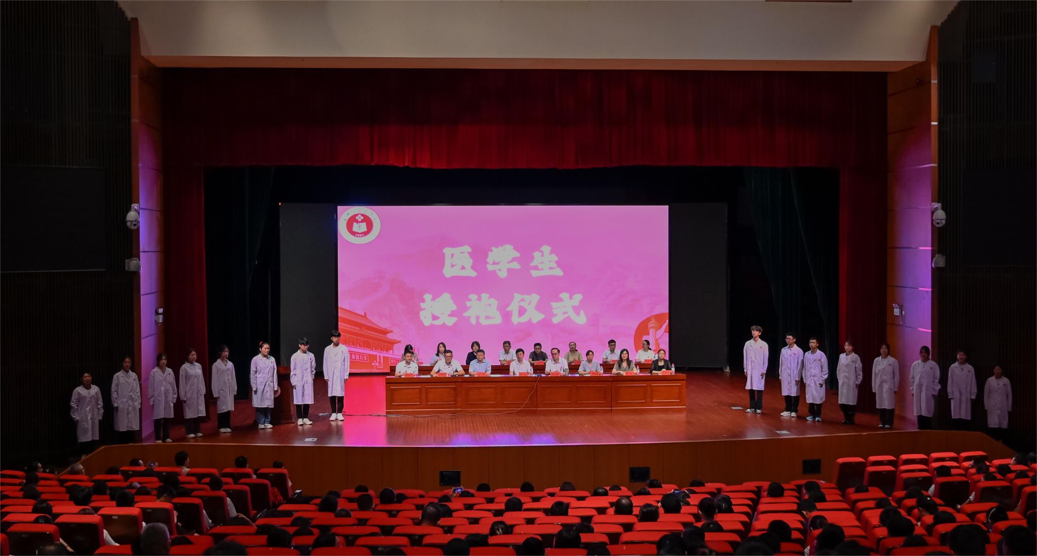 典礼上,学院为新生举行授袍仪式。16位新生代表依次上台,主席台就座的领导和老师们为新生授予白袍,并帮助新生整理仪表。对于新入学的医学生来说,这是一个重要的里程碑,授袍仪式标志着医学生涯的正式启航最后典礼在全体医学生庄严宣誓的“医学生誓言”中圆满落下帷幕