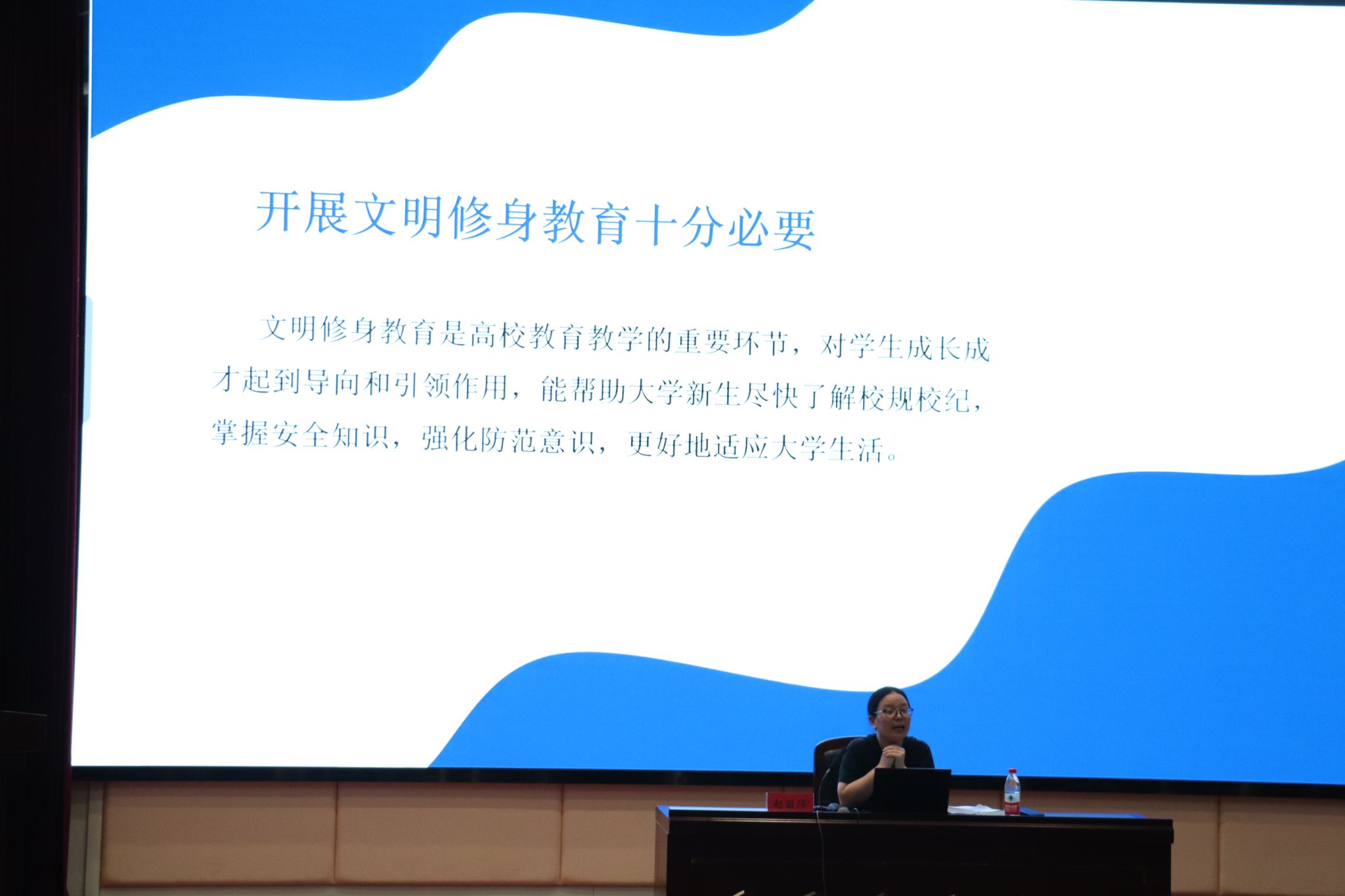 文明修身教育是高校教育教学的重要环节,中文av 学工办主任赵丽萍老师为大家开展了文明修身教育。本次讲座包括了学生奖学金评定,学生评优办法,学生违纪处分规定,学生考试违纪认定及处理方法,还开展了交通安全、网络言行、寝室安全教育等,此次讲座帮助了新生尽快了解校纪校规,掌握安全知识,更好的适应大学生活。