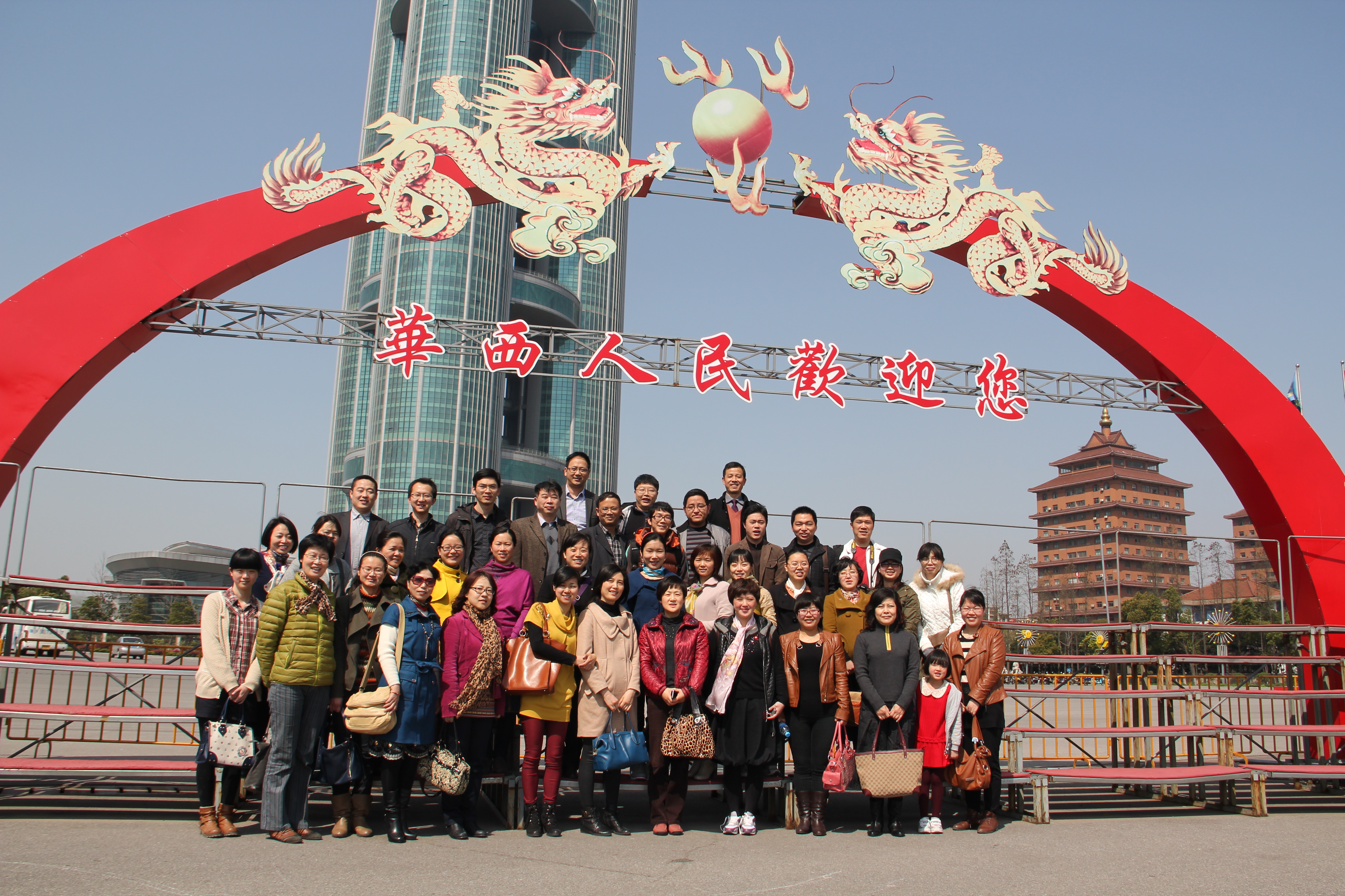 走进华西村,教师党员们来到民族宫观看华西特色艺术团文艺汇报演出,聆听老书记的治村经验,了解华西村壮大集体经济力量,最终达到共同富裕的过程。登上金塔十五楼,俯瞰华西全貌,体验社会主义新农村的生活宽裕,另外教师党员还参观了60周年纪念馆,游览了幸福园。