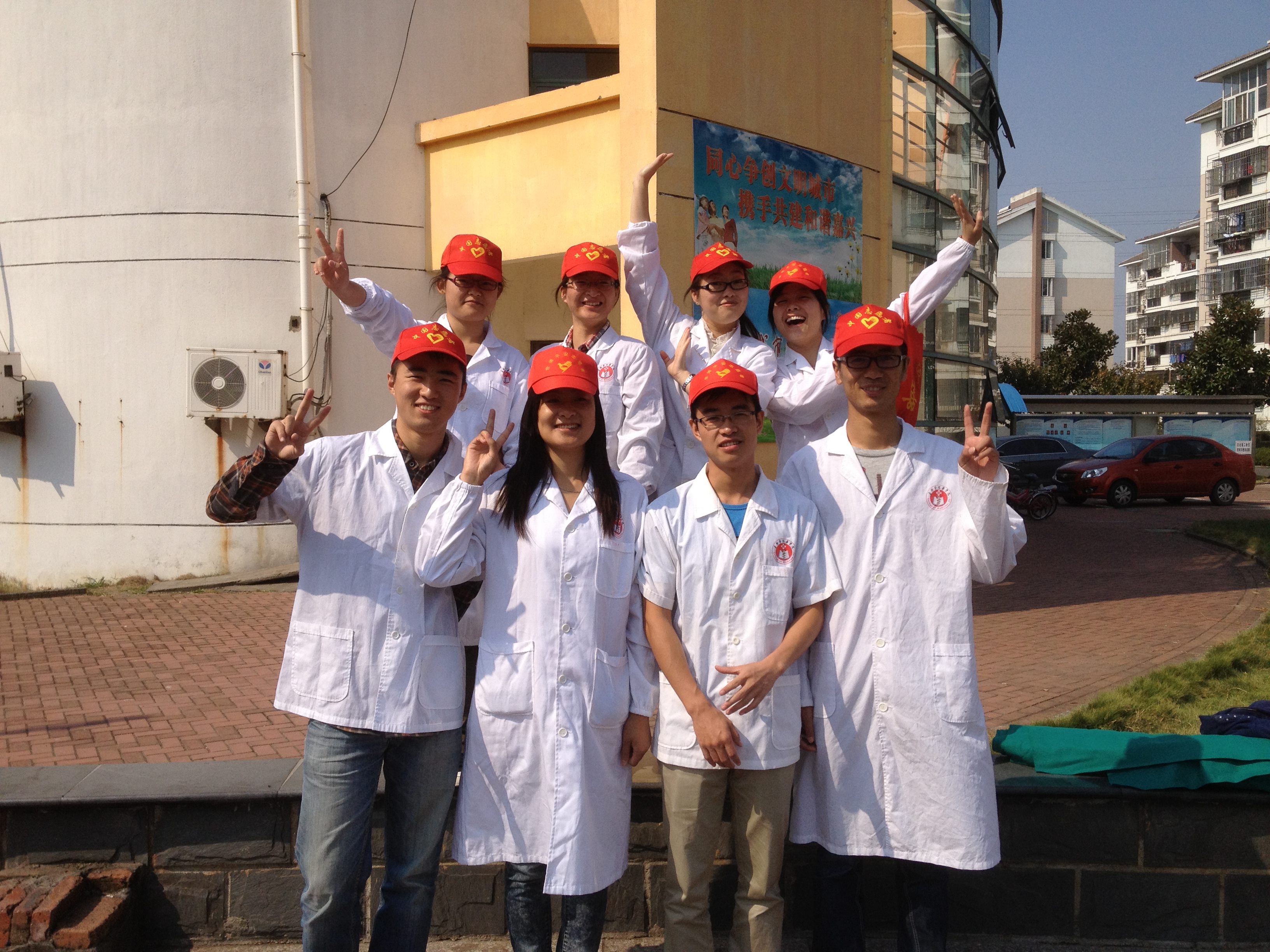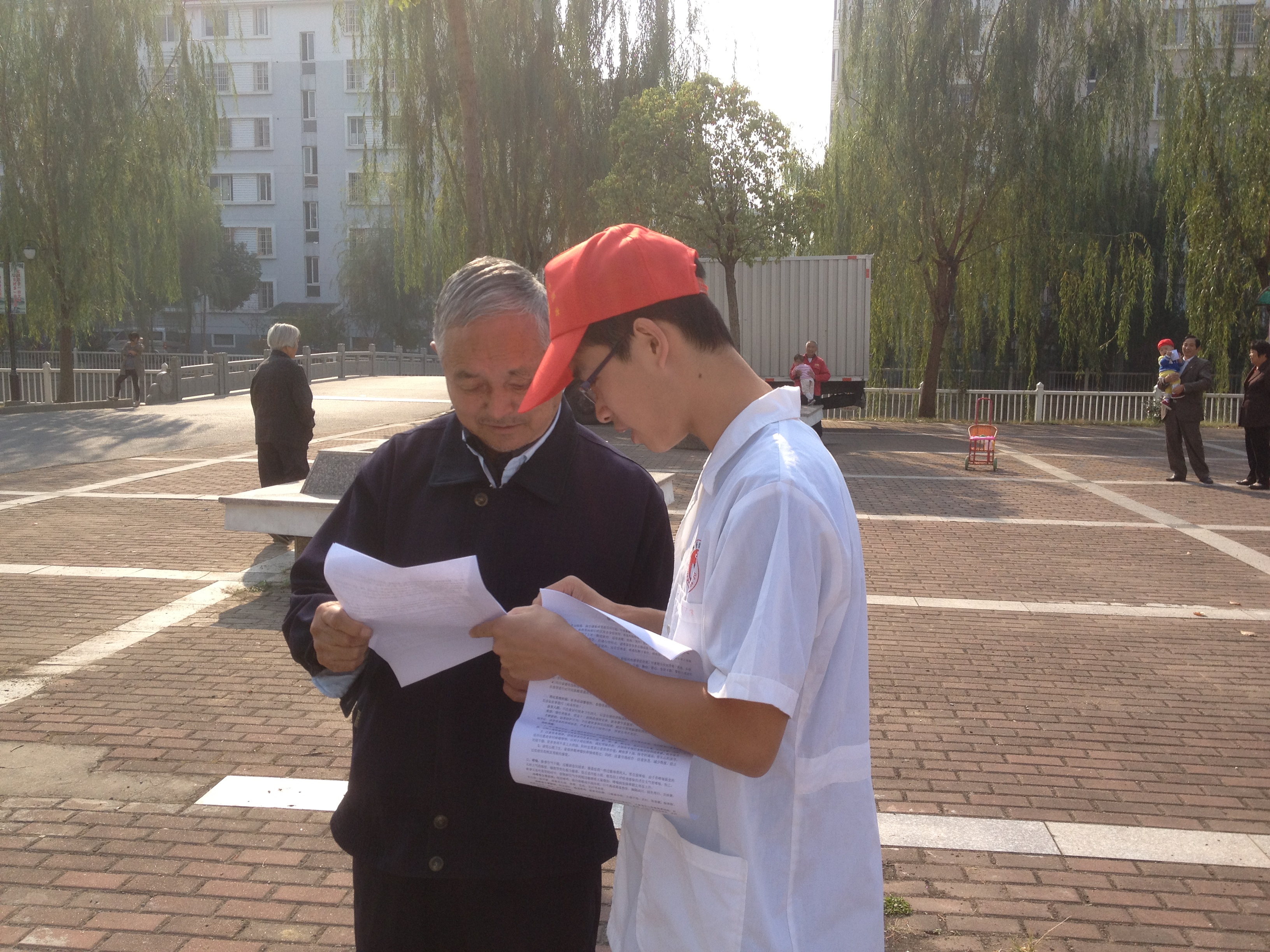 2012年10月19日上午9时左右,嘉兴学院中文av 医本091/092支部十名党员同学在金穗社区广场开展志愿者服务活动,吸引了现场很多老人和小孩参与。
