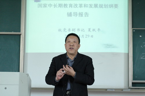 夏书记的报告从中国现代意义大学发展的历程、目前高等教育发展中存在的问题、纲要中涉及高等教育的亮点以及对学校改革发展的思考等四个方面,运用典型的案例、翔实的数据和自身学习工作经历,对《国家中长期教育改革和发展规划纲要》的政策背景、重大意义、高等学校改革主要内容、战略目标和主要任务作了分析和讲解,并针对高等教育中存在的同质化、行政化、人才培养质量不高等问题,强调必须把提高质量作为核心任务,加强学科团队建设,要准确定位、抓住机遇、办出特色。最后,夏书记向大家介绍了学校正在研究制定的校内管理体制机制改革方案的总体思路和目标。