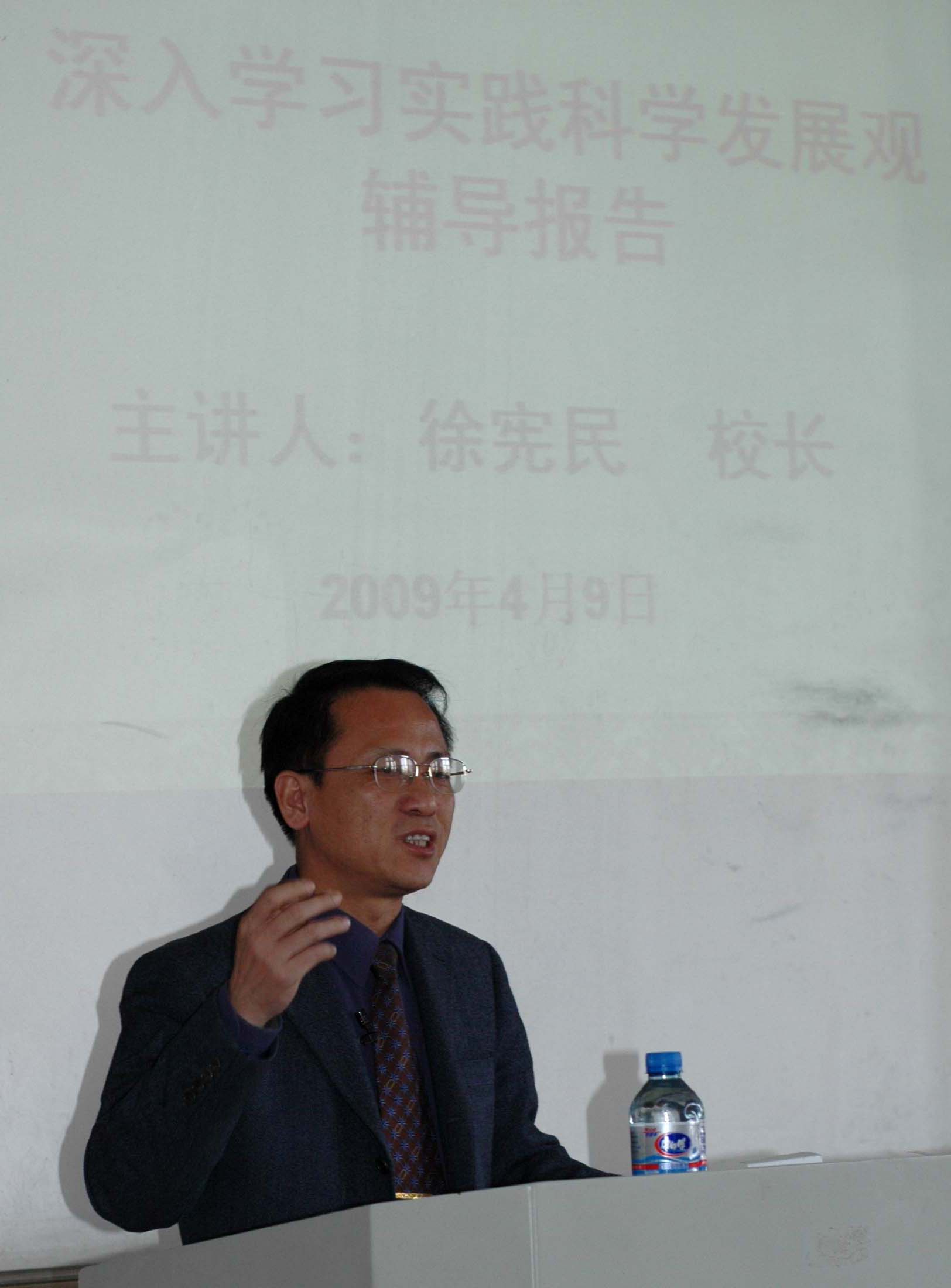 徐宪民校长在报告中结合嘉兴学院的实际对科学发展观的内涵进行了阐述,对现阶段学校存在的问题和主要特征进行剖析,强调要正视当前形势,找准问题,破解难题,形成发展的共识和合力。徐宪民校长强调,要以科学发展观为统领,处理好学校发展中“规模、结构、质量、效益”之间关系;学校要以学生为主体,办学要以教师为主体,体现以人为本;要围绕“巩固、深化、提高、发展”来推进改革,提高办学质量,实现学校和学院科学发展;二级学院要有自己发展目标和规划,并考虑学校、学院、教师、学生如何发展。徐校长最后希望全体教师思考如何当好一名大学教师?什么样的学生才是好学生?