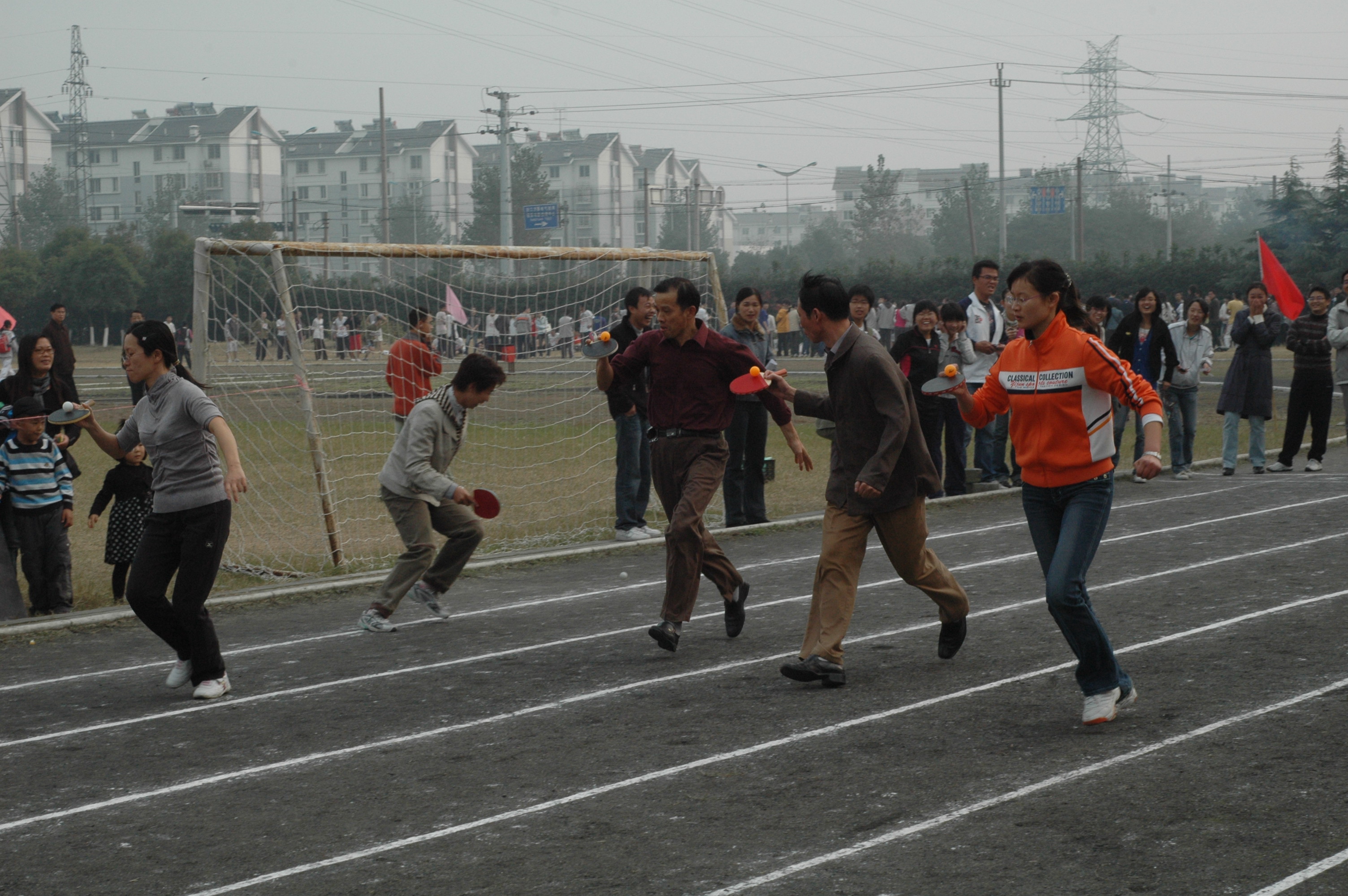师生的风采。中午在球场上举行了教工学生足球联谊赛,促进了师生间的感情和联系。下午全院教工在运动场的趣味比赛“齐心协力向前走”、“乒乓球接力赛”将运动场上气氛推上了高潮。此刻在梁林的体育场上,体育运动不仅仅是竞技,而更是一种活力的展现和对健康的追求。