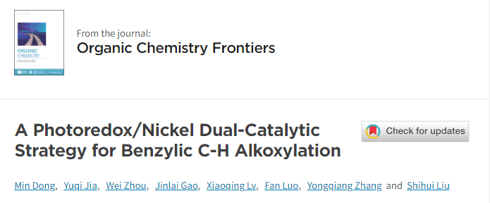 近日,我院药学系青年教师刘石惠博士以通讯作者身份在英文期刊《Organic Chemistry Frontiers》发表了论文“A Photoredox/Nickel Dual-Catalytic Strategy for Benzylic C-H Alkoxylation”(DOI: 10.1039/D1QO01421H),嘉兴学院为该论文的第一通讯单位。药学18级学生董敏和药学20级学生贾雨琪为论文的共同第一作者。