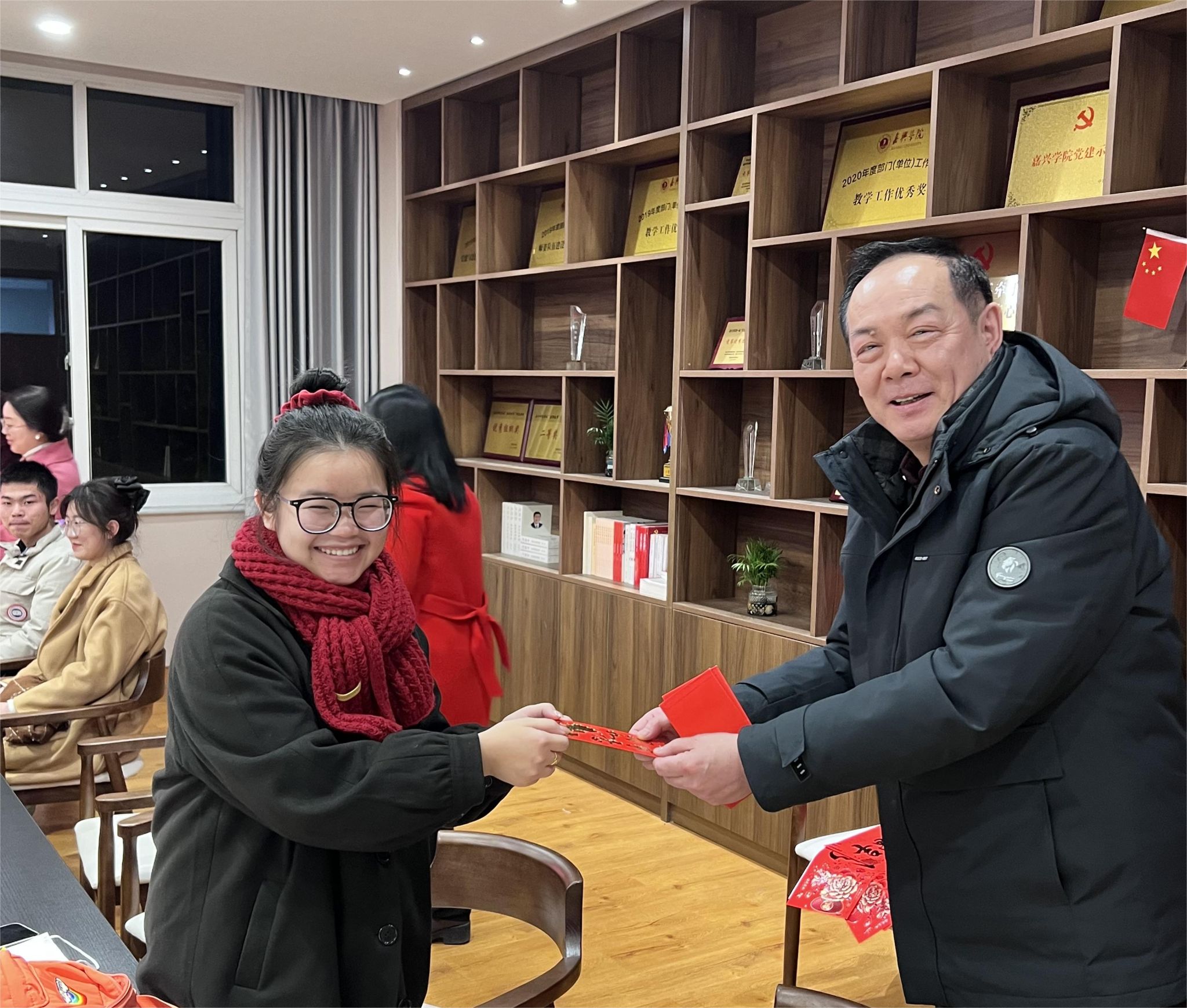 随后,陈云飞给每位学生发放了压岁红包,并赠送了新年礼包和春联,希望在新的一年,同学们健康成长。参会同学们纷纷表示,这样的交流会很有意义,学院的慰问和老师们的祝福非常暖心!