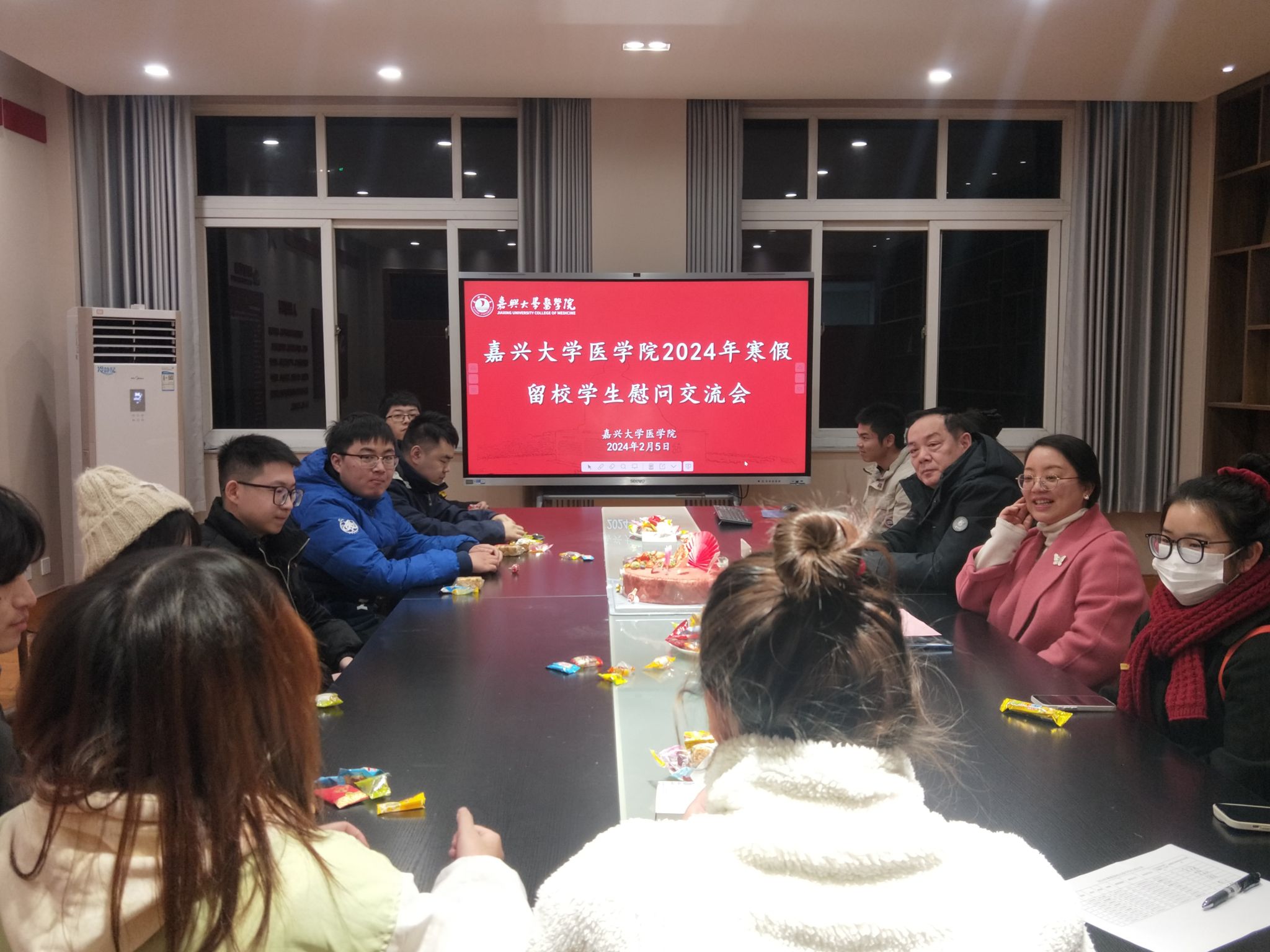 在仁心楼231会议室举行2024年寒假留校学生慰问交流会。学院党委书记陈云飞、副书记朱莹和学工办主任赵丽萍与留校学生交流近期学习工作,慰问不能回家过年的留校学生。