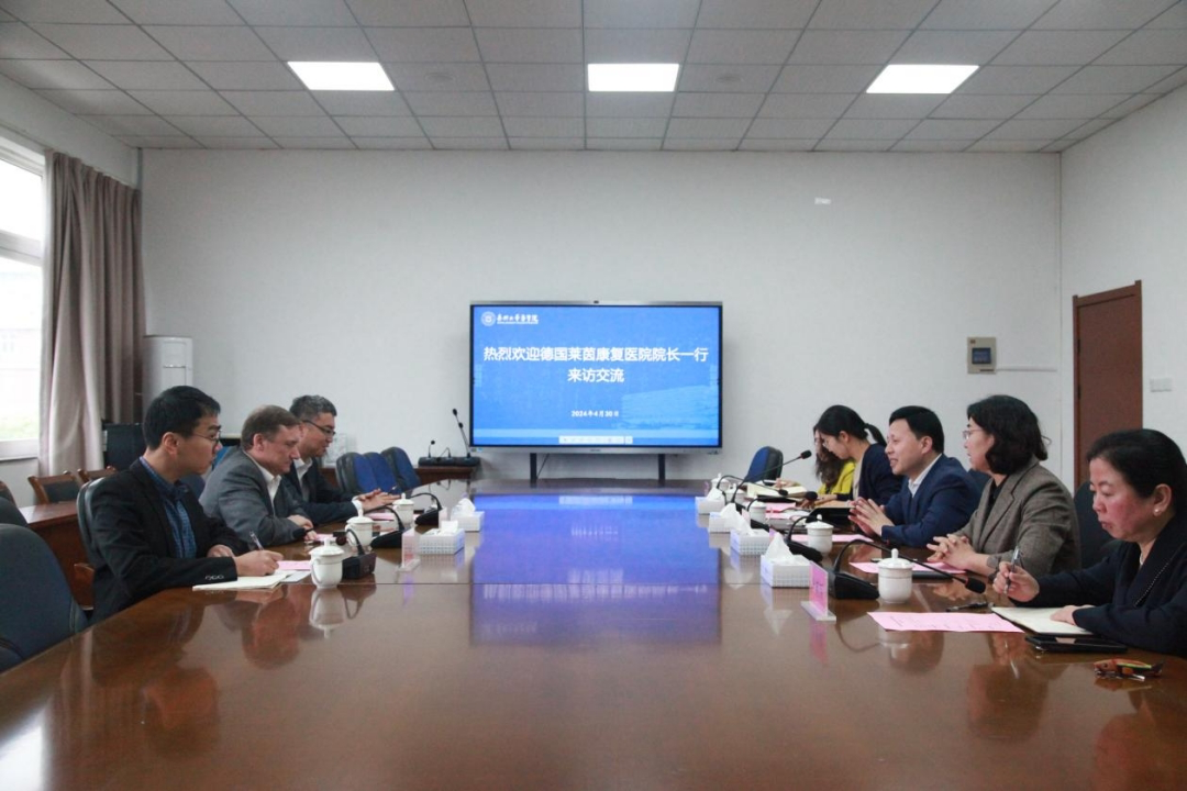 4月30日下午,德国莱茵康复医院院长亨里克·舒尔策及德国弗莱堡经济发展署中国事务办公室主任陈炼及嘉兴市人民政府外事办公室国际交流处何晨山来中文av 访问交流。国际交流与合作处处长潘巍巍、中文av 院长何治、中文av 护理系副主任李英丽、国际交流与合作处何俸华出席会议。会议由中文av 副院长孙李丹主持。