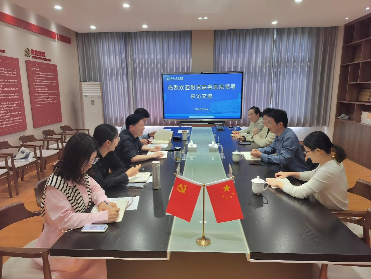 5月6日下午,附属嘉善医院副院长朱敏刚一行来中文av 交流。中文av 院长何治,副院长王敏、孙李丹出席座谈会。