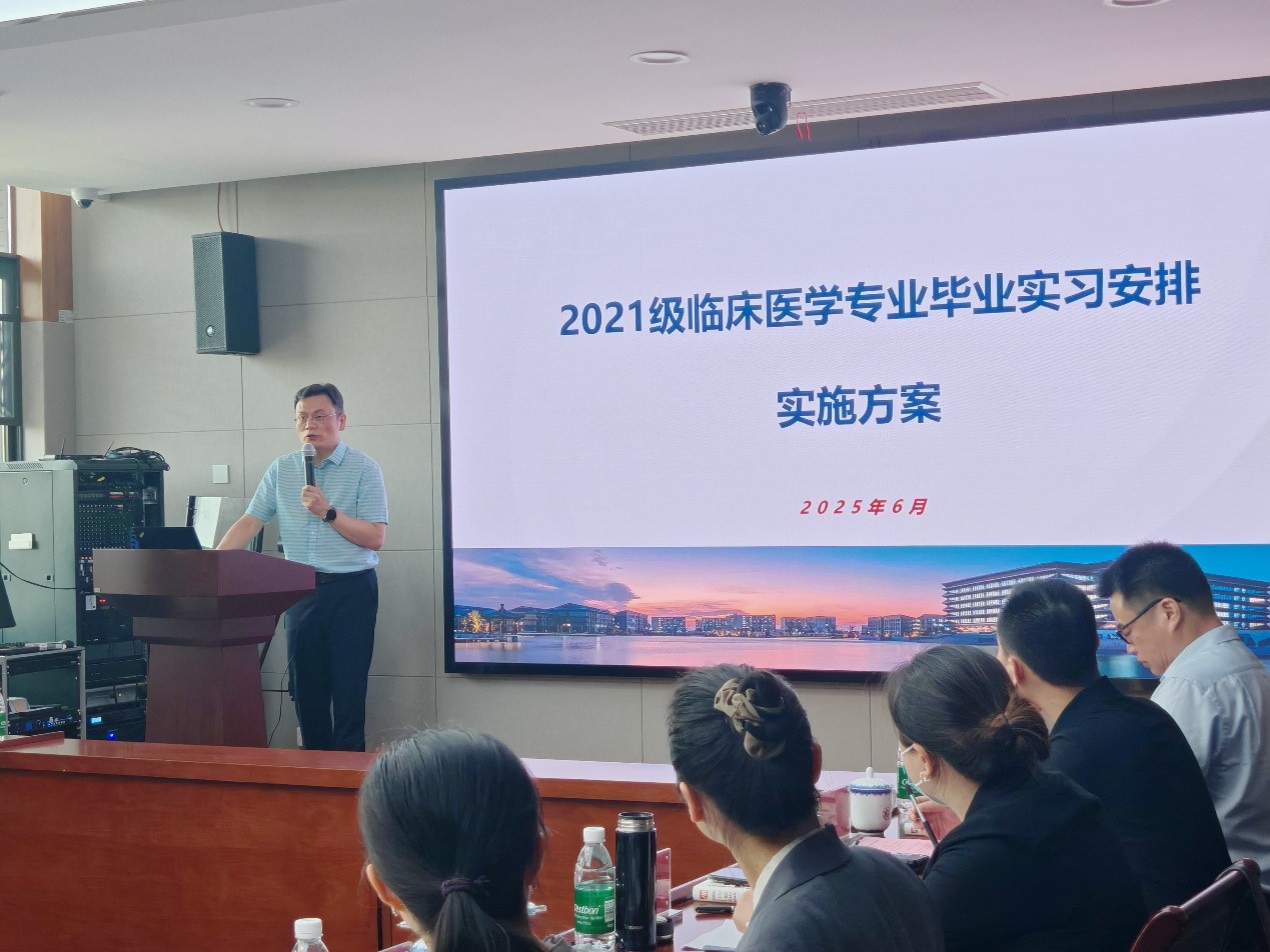 临床医学专业毕业实习教学工作的支持。他指出,新的临床医学专业毕业实习实施方案经过长期的调研和征求相关权威专家的意见,既符合临床医学专业认证的要求,又有特色、善创新。他强调,毕业实习是教学计划及人才培养方案的重要环节,对夯实医学生专业基础、提升医学生综合素养具有至关重要的作用。他要求医管办和各附属医院高度重视,统筹协调,根据各附属医院交流讨论的意见和建议,结合各附属医院的教学与资源情况进一步完善,严格按照实习安排方案与工作要求落实临毕业实习安排工作,确保实习安排科学合理、稳定有序。