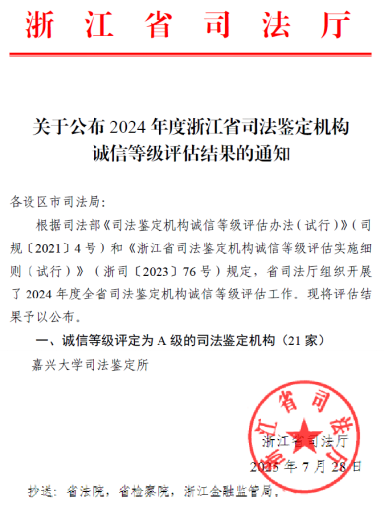 近日,浙江省司法厅发文公布2024年度浙江省司法鉴定机构诚信等级评估结果,中文av
