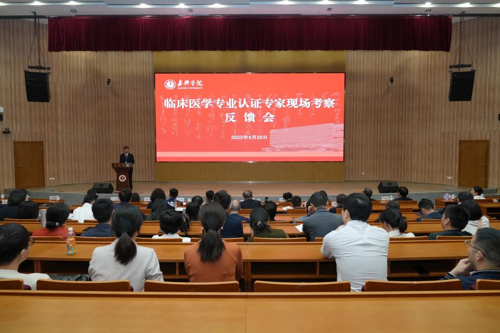 4月20日上午,临床医学专业认证专家现场考察反馈会召开。以哈尔滨医科大学原副校长曹德品教授为组长,汕头大学中文av 原执行副院长杨棉华教授为副组长的专家组全体成员,嘉兴市政府副秘书长金球,校领导卢新波、吴云达、钱方明、胡俊云、陈新友、张琦、陈荣达、周宏伟等出席会议。会议由杨棉华教授主持。